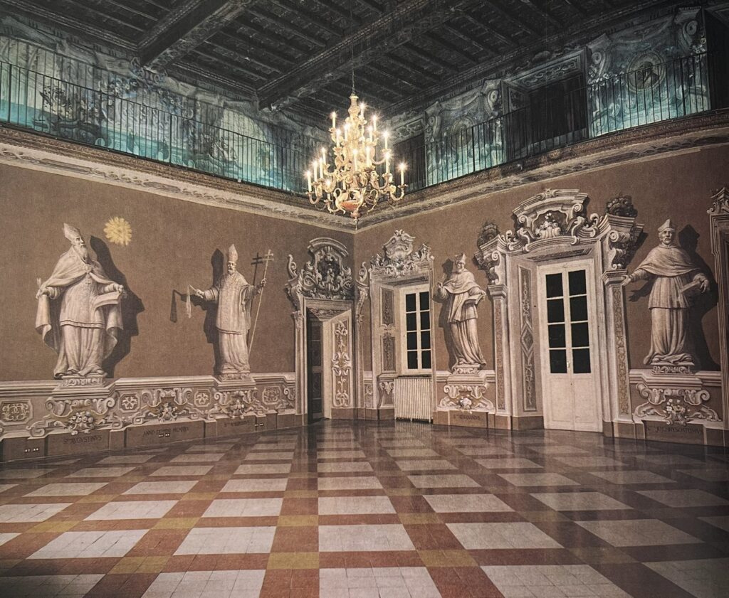 Il Pontificio Collegio Gallio di Como venne fondato nel 1583 dal cardinale Tolomeo Gallio per favorire l’educazione dei giovani. La sede prescelta fu l’ex convento degli Umiliati, che fu riqualificato per diventare sede adeguata ad un collegio. Questo primo nucleo è stato poi interessato da una serie di interventi architettonici e decorativi che gli hanno conferito la veste odierna. Tra questi spiccano lo scalone d’onore e l’attuale aula magna, dove, tra le altre cose, è possibile ammirare l’affresco di Carlo Innocenzo Carloni, la statua lignea di Andrea Radaelli e una notevole decorazione che alterna cornici dipinte a figure di santi a monocromo.