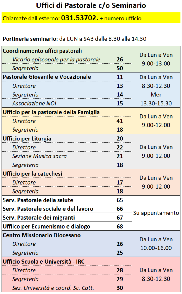 Nello specchietto (cliccare sull’immagine per ingrandirla) sono riportati i numeri telefonici degli Uffici di Pastorale ubicati presso il Seminario Vescovile di via Baserga. La struttura è accessibile durante gli orari di apertura della portineria del seminario (tutti i giorni, dal lunedì al sabato, dalle 8.30 alle 14.30). Per agevolare il lavoro e la comunicazione con gli uffici, si è pensato di mantenere, come in precedenza, la possibilità di contattare telefonicamente i singoli uffici senza dover passare attraverso un numero guida o un centralino a risposta automatica. È sufficiente quindi comporre il numero 031.53702 seguito dal codice del singolo ufficio; la chiamata verrà passata direttamente all’interno desiderato.