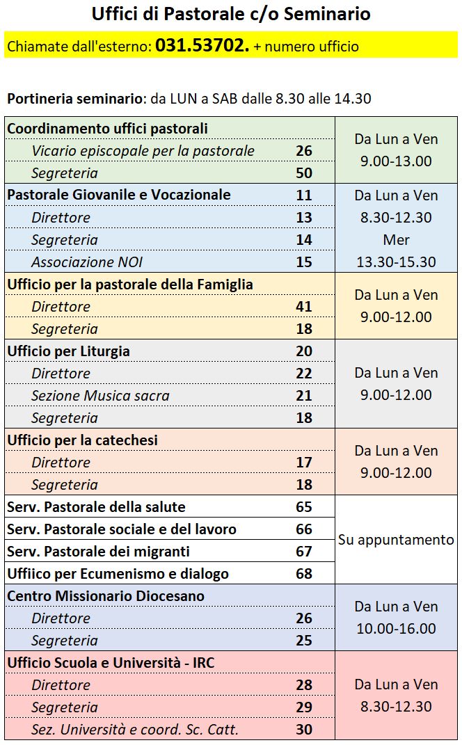 Nello specchietto (cliccare sull’immagine per ingrandirla) sono riportati i numeri telefonici degli Uffici di Pastorale ubicati presso il Seminario Vescovile di via Baserga. La struttura è accessibile durante gli orari di apertura della portineria del seminario (tutti i giorni, dal lunedì al sabato, dalle 8.30 alle 14.30). Per agevolare il lavoro e la comunicazione con gli uffici, si è pensato di mantenere, come in precedenza, la possibilità di contattare telefonicamente i singoli uffici senza dover passare attraverso un numero guida o un centralino a risposta automatica. È sufficiente quindi comporre il numero 031.53702 seguito dal codice del singolo ufficio; la chiamata verrà passata direttamente all’interno desiderato.