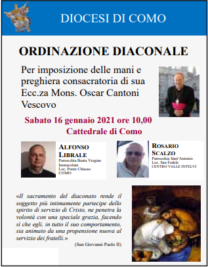 Sabato 16 gennaio alle ore 10:00 nella Cattedrale di Como, per mano del Vescovo Oscar Cantoni, hanno ricevuto l’ordinazione diaconale Alfonso Librale (della parrocchia Beata Vergine Maria a Como-Ponte Chiasso) e Rosario Scalzo (della parrocchia Sant’Antonio – località San Fedele Centro Valle Intelvi).