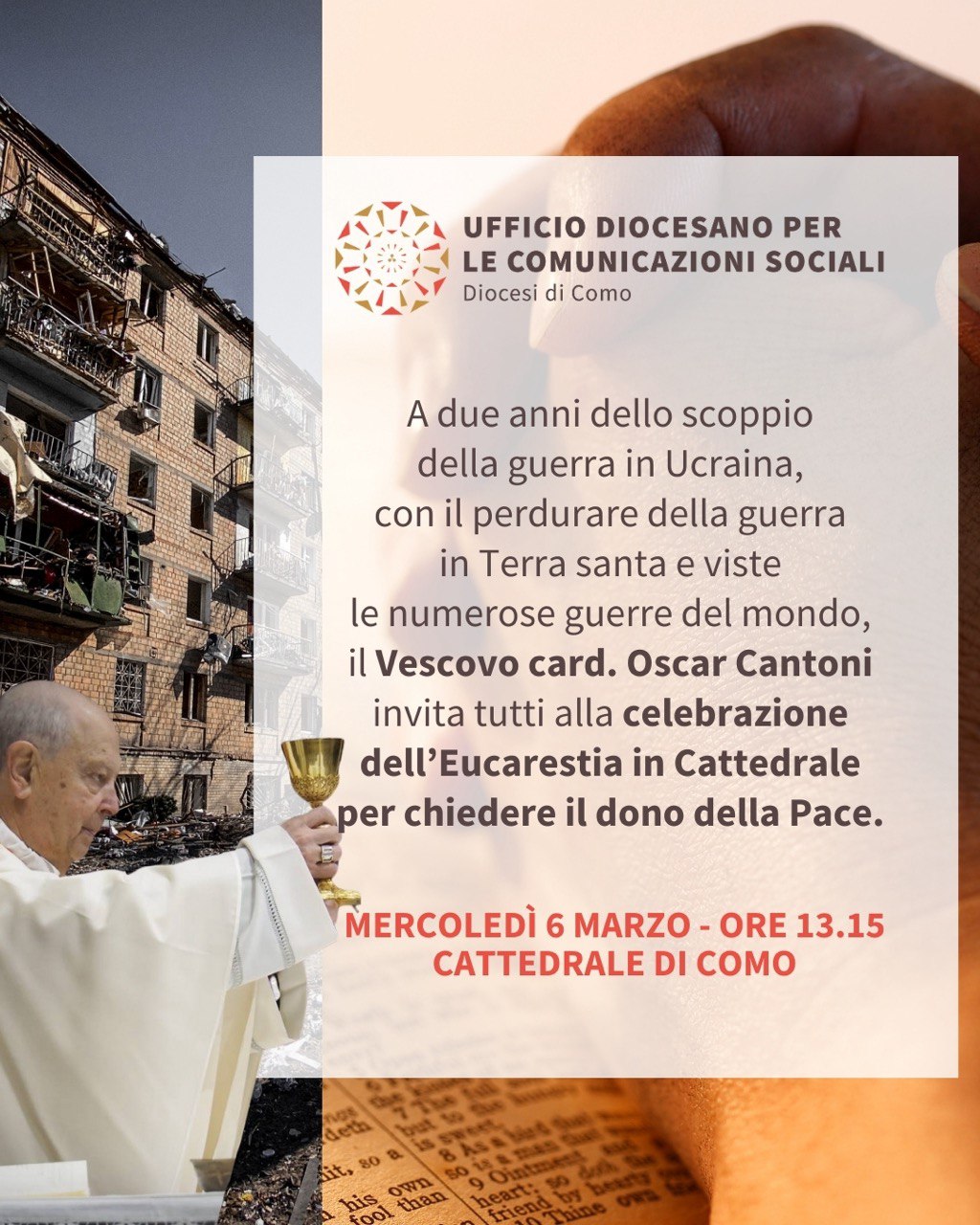 «A due anni dallo scoppio della guerra in Ucraina, con il perdurare della guerra in Terra Santa, viste le numerose guerre nel mondo e i tanti conflitti armati, invito tutti a pregare incessantemente per il dono della pace. In particolare, mercoledì 6 marzo, alle ore 13.15, in Cattedrale, a Como, celebreremo la Santa Messa nel Tempo di Quaresima: insieme, nella liturgia, esprimeremo la nostra supplica, affinché cessino le guerre, che causano vittime, dolore e distruzione, e perché possa iniziare un cammino di costruzione della pace, fondato sulla giustizia e la fraternità.