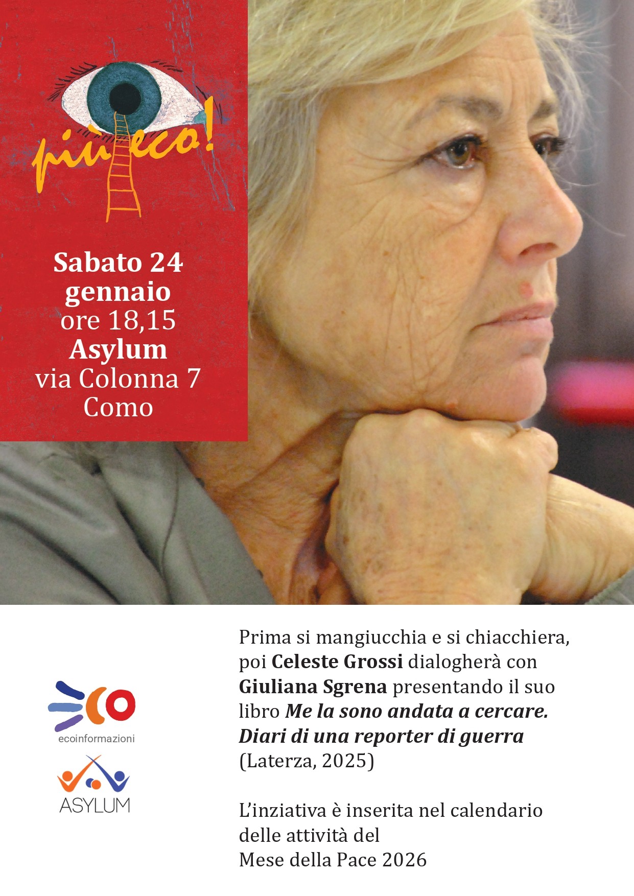 Sabato 24 gennaio, ore 18.00, presso Asylum, in via Colonna 7 a Como-Camerlata, Celeste Grossi dialogherà con l’autrice GIULIANA SGRENA, che è stata per quasi trent’anni inviata speciale in tutti i maggiori conflitti: dall’Algeria all’Iraq, dalla Somalia all’Afghanistan, dalla Siria all’Eritrea.