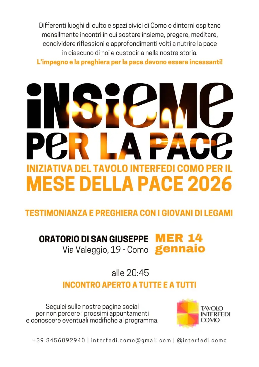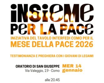 Mercoledì 14 gennaio, ore 20.45, presso l’Oratorio di S. Giuseppe in Via Valleggio 19 a Como: “TESTIMONIANZA E PREGHIERA CON I GIOVANI DI LEGÀMI”. Iniziativa del TAVOLO INTERFEDI COMO per il MESE DELLA PACE. L’impegno e la preghiera per la pace devono essere incessanti!