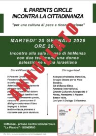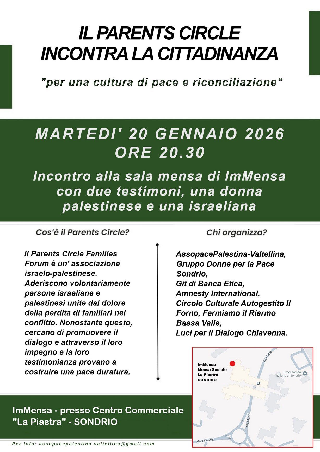 Martedì 20 gennaio, ore 20.30, presso la mensa sociale “ImMensa” a Sondrio: incontro con il Parents Circle – Families Forum. Sarà possibile ascoltare due testimonianze, una palestinese e una israeliana, con l’obiettivo di promuovere confronto e riconciliazione attraverso storie personali.