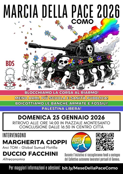 Domenica 25 gennaio, ore 14, Piazzale Montesanto: “MARCIA DELLA PACE” promossa dal Coordinamento comasco per la Pace e dalle realtà che partecipano alla costruzione del calendario del Mese della Pace. Titolo dell’edizione 2026: “Blocchiamo la corsa al riarmo!”. Conclusione prevista alle 16.30 in centro città.