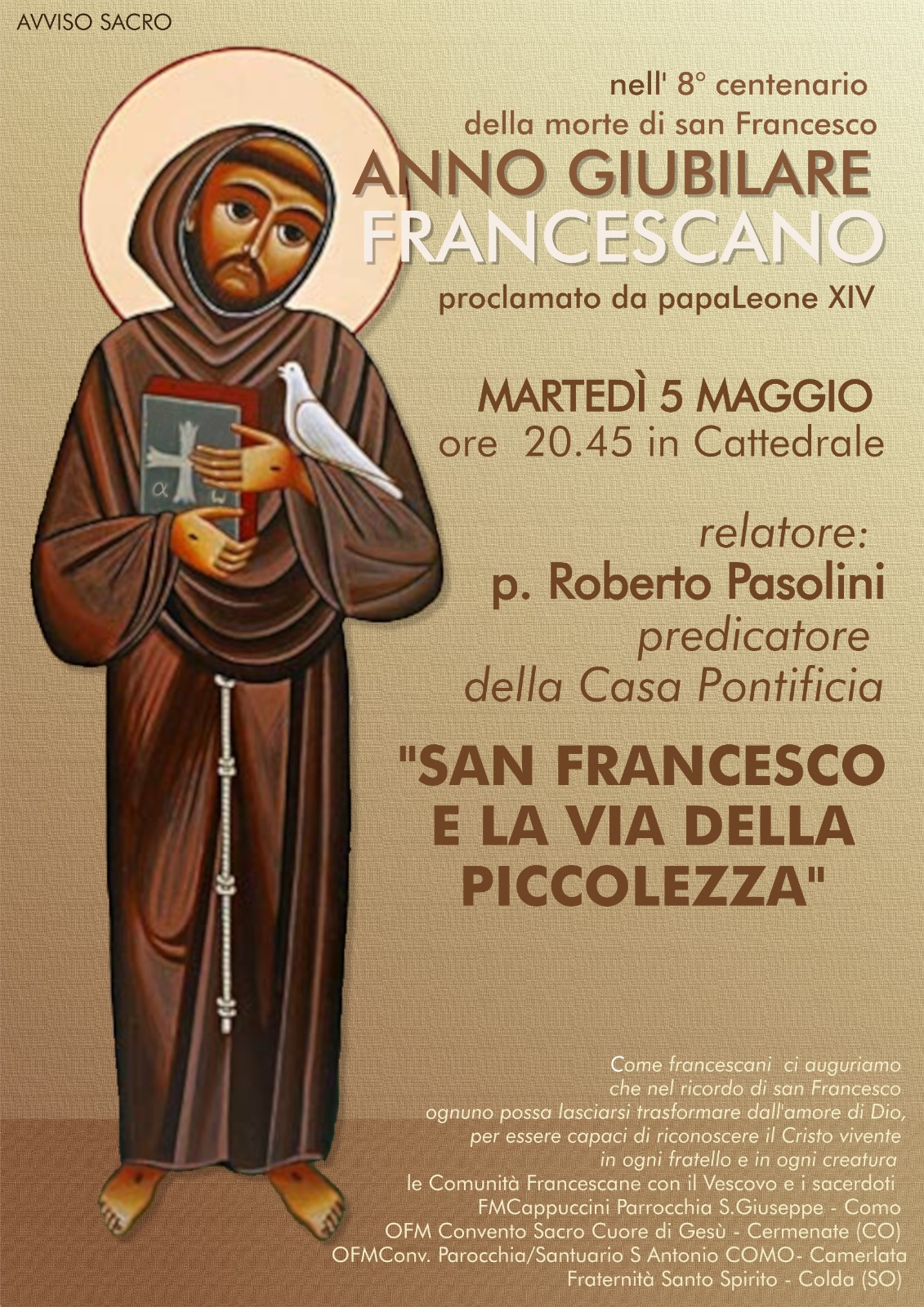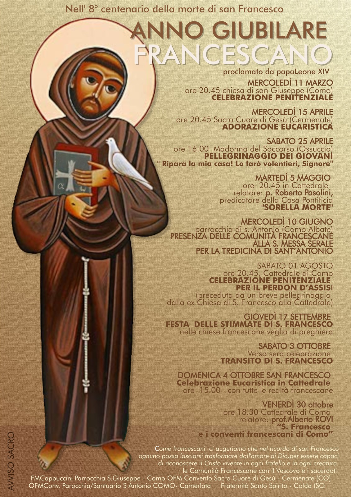 L’evento è organizzato dalle Comunità Francescane con il Vescovo e i sacerdoti. FM Cappuccini Parrocchia San Giuseppe – Como, OFM Convento Sacro Cuore di Gesù – Cermenate (CO), OFM Conv. Parrocchia/Santuario S. Antonio – Como, Fraternità Santo Spirito – Colda SO.
