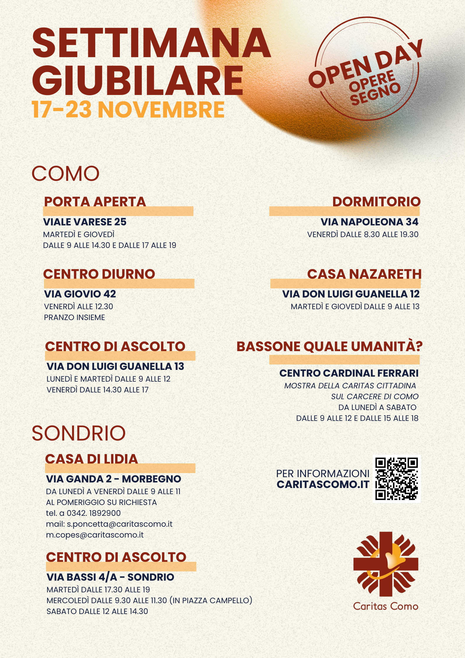 La Caritas diocesana di Como, dal 17 al 23 novembre, ha istituito una vera e propria Settimana Giubilare e apre le porte delle proprie Opere Segno a Como, Sondrio e Morbegno (So), offrendo l’opportunità di conoscere da vicino i luoghi e le persone che ogni giorno si impegnano nel servizio ai più fragili. In molti di questi luoghi saranno gli ospiti ad affiancare volontari e operatori nel racconto delle diverse realtà, così proporre una narrazione non “degli” ultimi ma “con” gli ultimi.