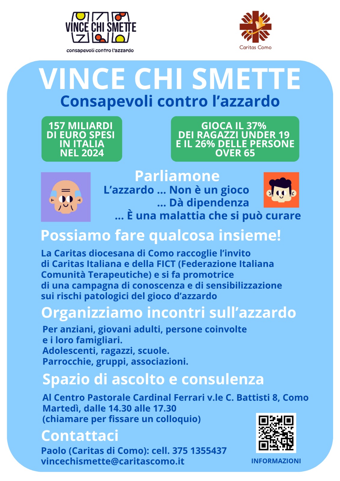 Anche a Como parte il progetto “Vince chi smette”, attraverso il quale Caritas Italiana intende sensibilizzare le comunità sul fenomeno dell’azzardo e sui rischi a esso associati. Il progetto mira a costruire una coscienza critica collettiva e a promuovere azioni concrete di contrasto e prevenzione. L’iniziativa è costruita in collaborazione con FICT (Federazione Italiana delle Comunità Terapeutiche).