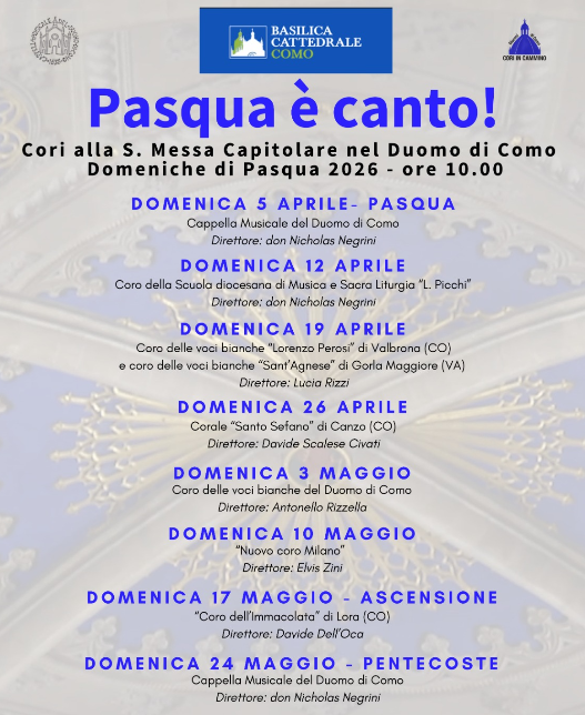 – Presentazione dell’iniziativa “Pasqua è canto” – con locandina + link con intervista al Maestro di Cappella del Duomo di Como, don Nicholas Negrini: https://www.swisstransfer.com/d/033d7e0f-fe97-4d52-953d-50e1419852e7